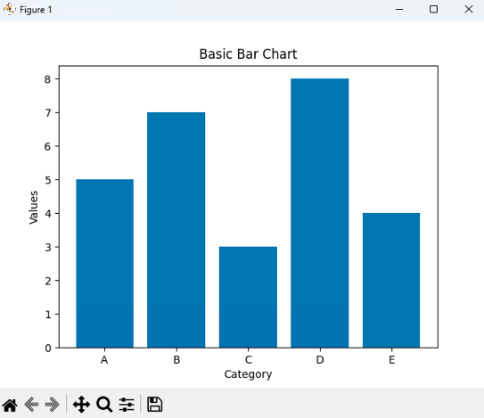 plt.bar()는 막대 그래프를 그리는 함수입니다. 카테고리별 값의 높이를 막대로 표시합니다.