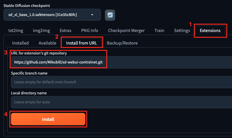 - URL for extension's git repository에 ControlNet을 설치하는 URL (https://github.com/Mikubill/sd-webui-controlnet.git)을 기입합니다.