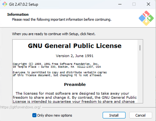 다운로드한 설치 프로그램 Git-2.47.0.2-64-bit.exe을 실행합니다. 각 단계의 Next 버튼을 클릭합니다. 모든 단계에서 기본값으로 선택하고 Install 버튼이 나올때까지 Next 버튼을 클릭합니다. 이후 Install 버튼을 누르고 Finish 버튼이 나오면 정상적으로 설치가 되었습니다.
