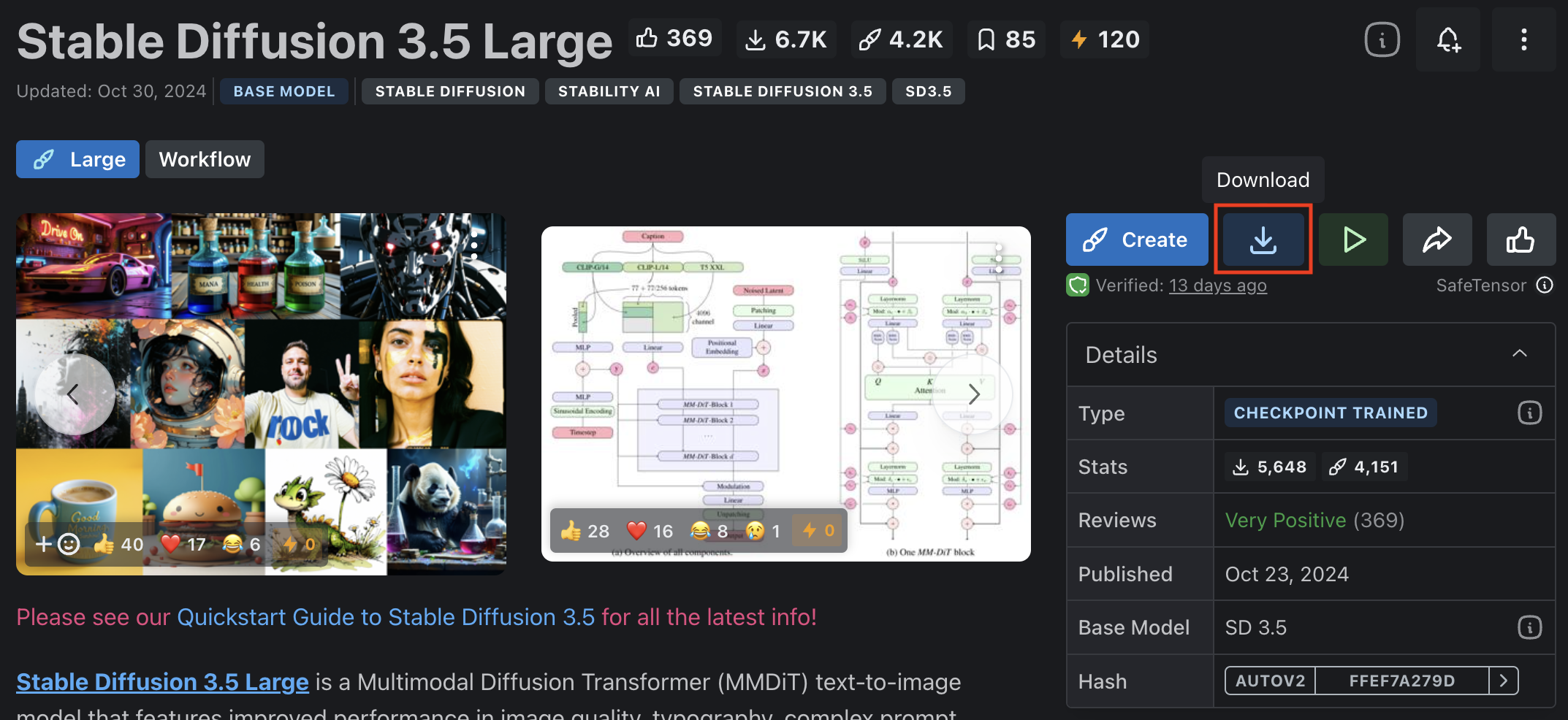 Checkpoint의 샘플로서 stabilityai/stable-diffusion-3.5-large의 모델을 다운로드해 보겠습니다.