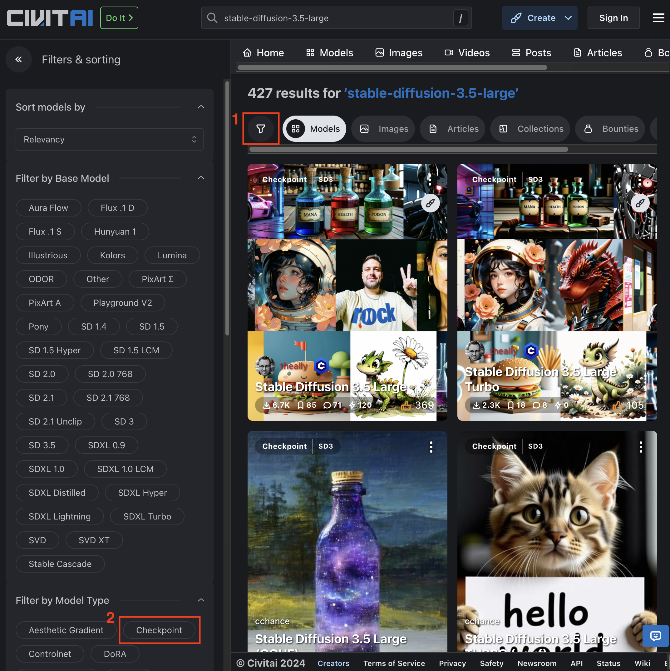 Civitai로 이동하여 검색창에 모델 파일 이름을 입력합니다. ("stable-diffusion-3.5-large") 그러고 필터 아이콘을 클릭 후에, "Filter by Model Type" 항목에서 Checkpoint 를 클릭하면 해당 모델 파일의 이미지가 보입니다.