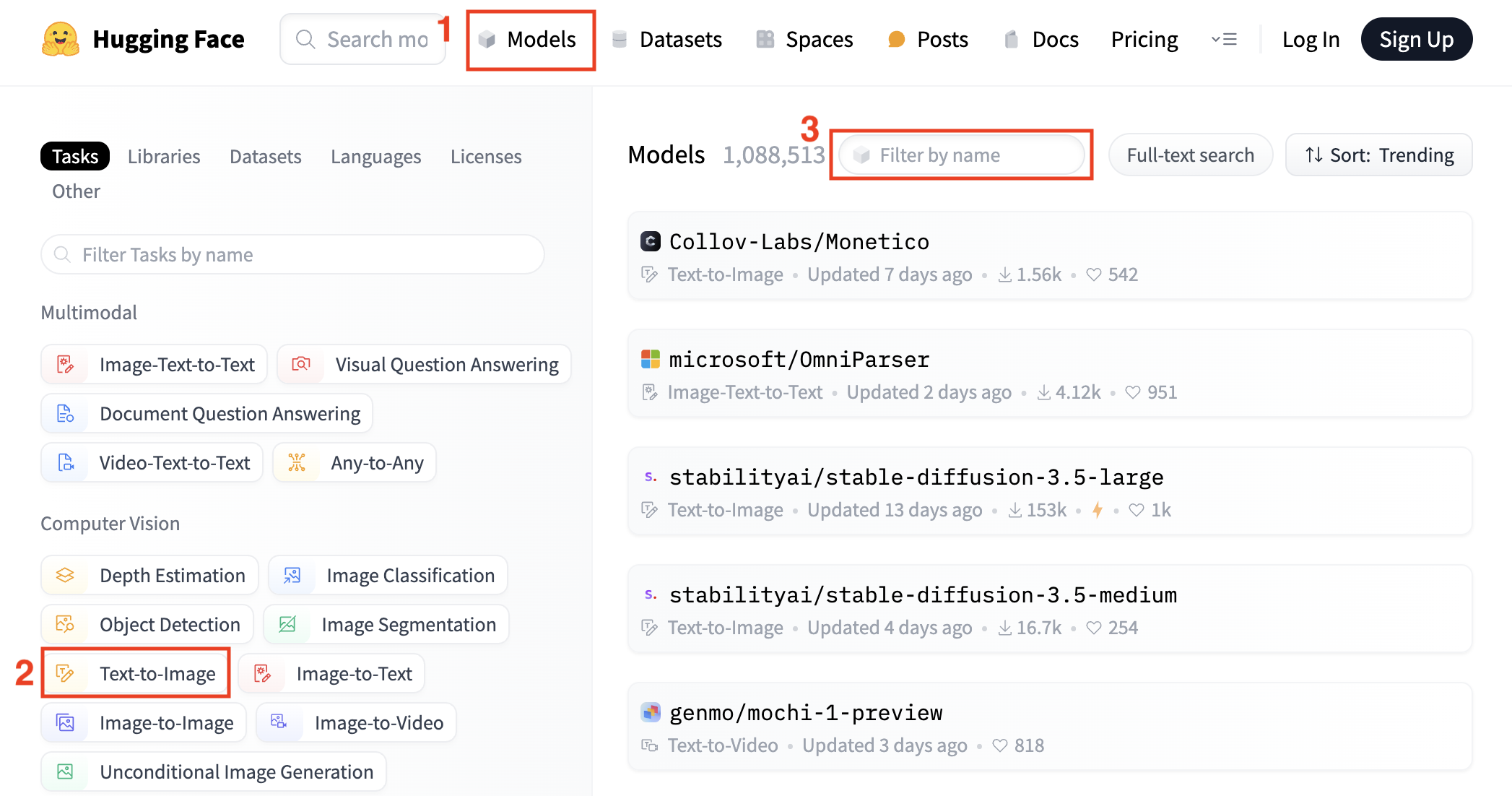 Huggig Face로 이동하여 헤더에서 Models를 클릭하고, Text-to-Image를 클릭한다. 그러고, 입력란에 "stabilityai/stable-diffusion-3.5-large"를 입력하고 아래에 찾아진 모델을 클릭합니다.