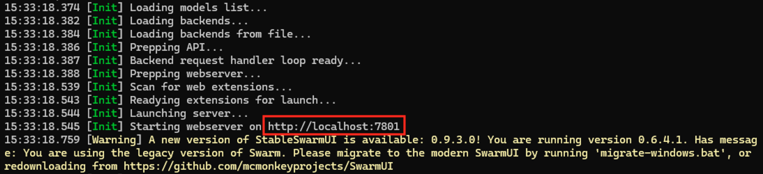 설치가 완료되면 터미널에 [Starting webserver on http://localhost:7801]이 표시되고 SwarmUI가 자동으로 시작합니다.