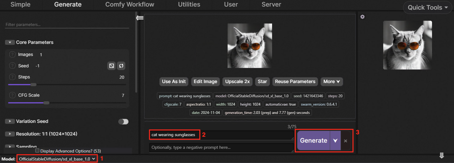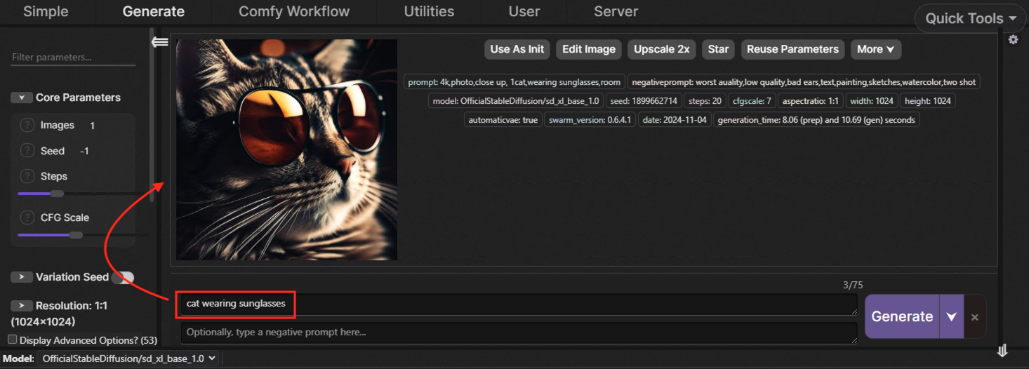 [Prompt]에 "cat wearing sunglasses"를 입력하고 [Generate]를 클릭하면 "썬글라스를 쓴 고양이"의 이미지가 출력됩니다.