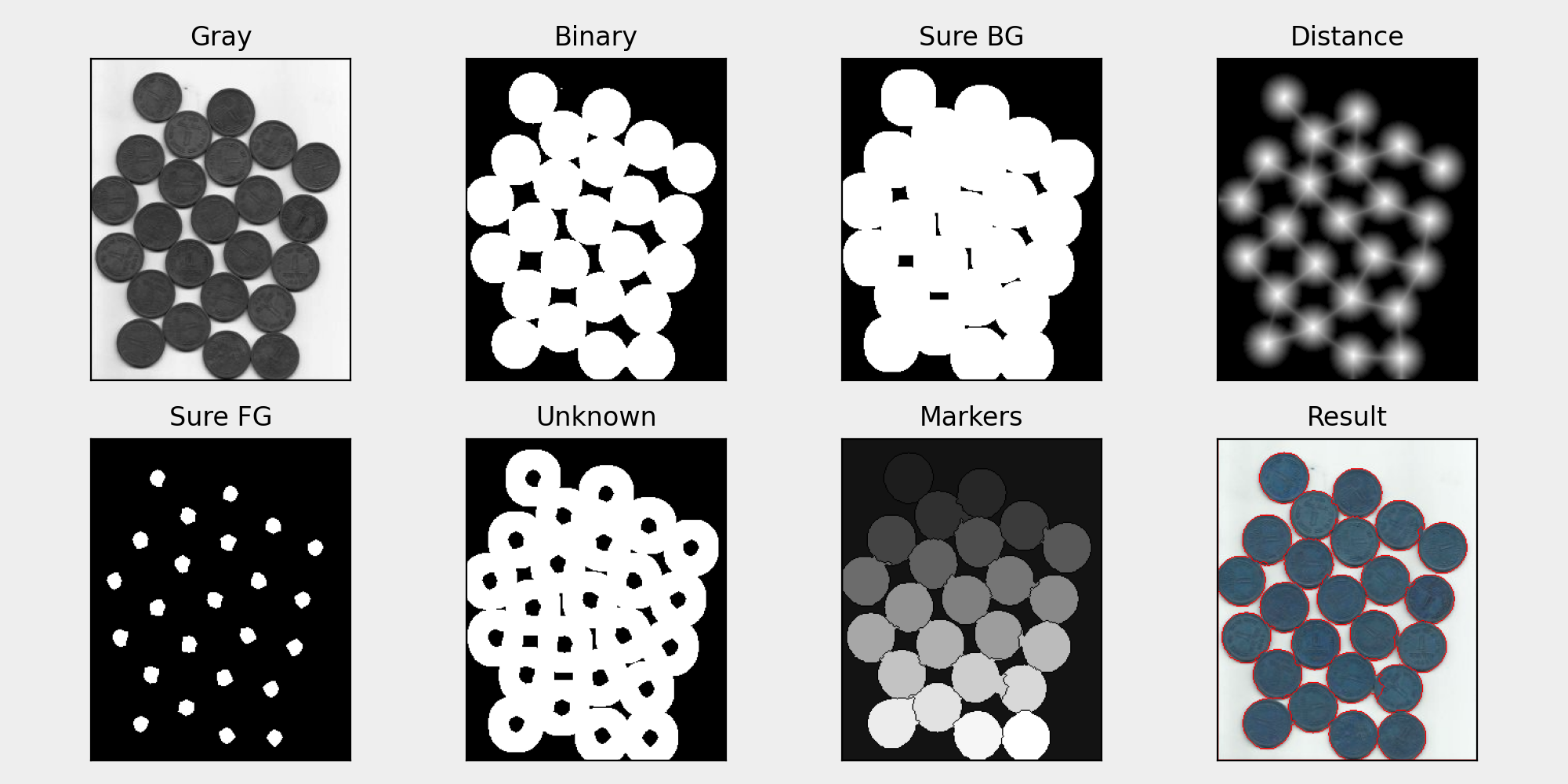 titles = ['Gray', 'Binary', 'Sure BG', 'Distance', 'Sure FG', 'Unknown', 'Markers', 'Result']