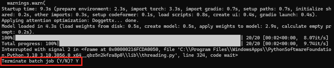 Stable Diffusion WebUI를 종료하려면 터미널에서 [Control + C] 키를 눌러 "배치 작업을 종료하시겠습니까?"라는 질문을 받으므로 [Y] 키를 입력하고 [Enter] 키를 누르면 종료합니다.