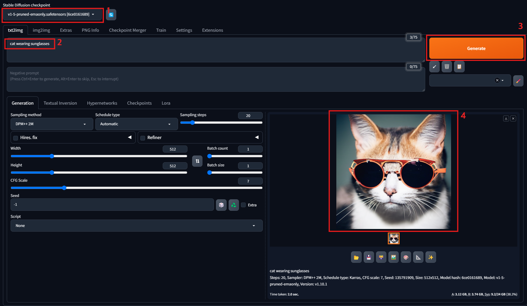 [Prompt]에 "cat wearing sunglasses"를 입력하고 [Generate]를 클릭하면 "썬글라스를 쓴 고양이"의 이미지가 출력됩니다.