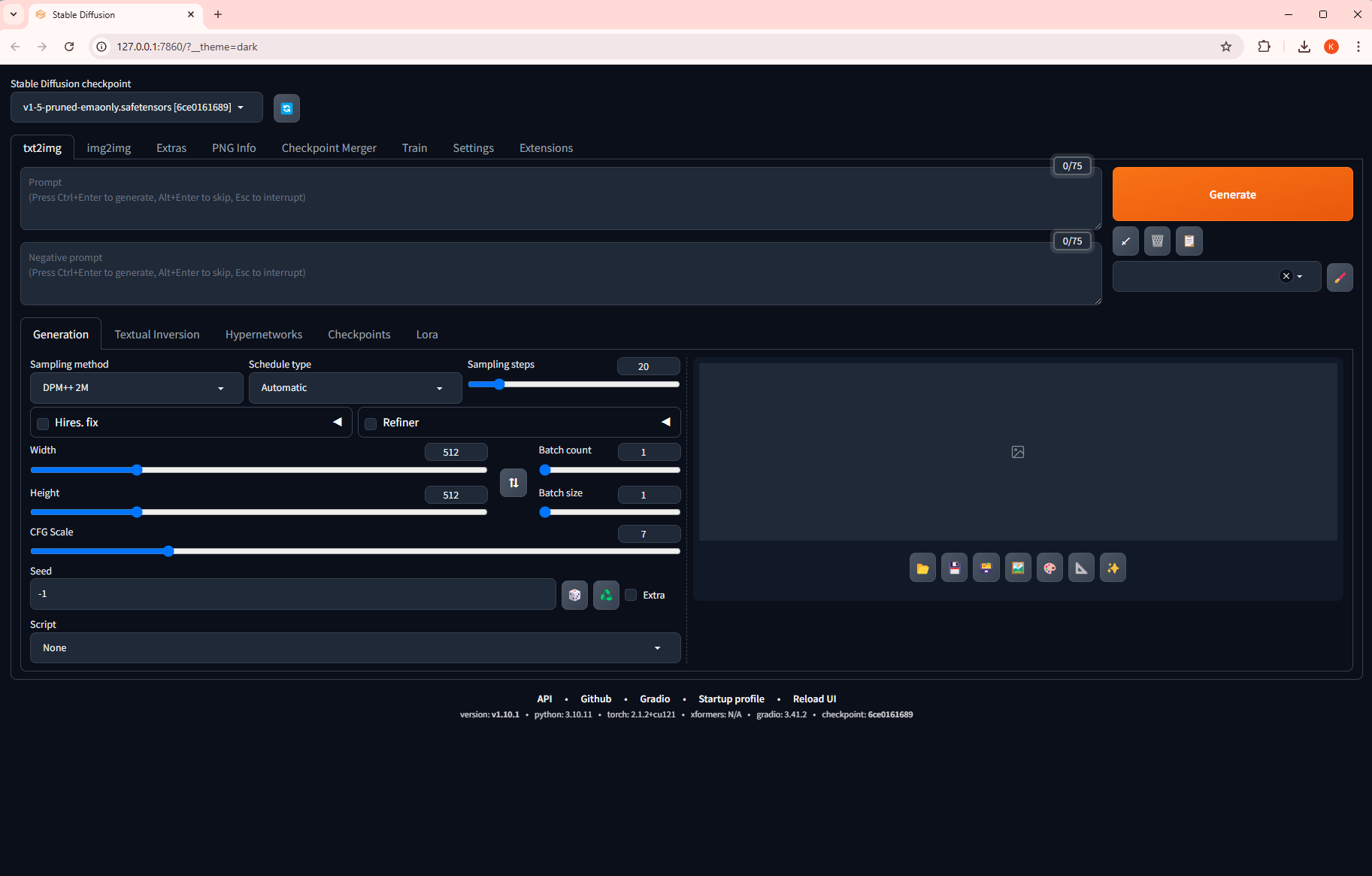 Stable Diffusion WebUI가 자동으로 시작되지 않으면 브라우저의 주소 표시줄에 "http://127.0.0.1:7860"을 입력하고 "Enter" 키를 누르면 동일하게 접속이 가능합니다.