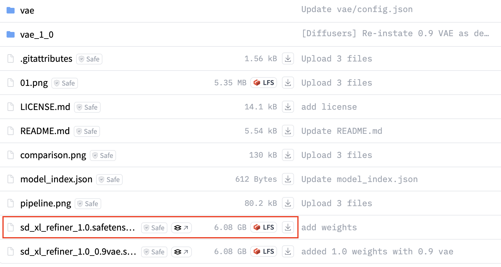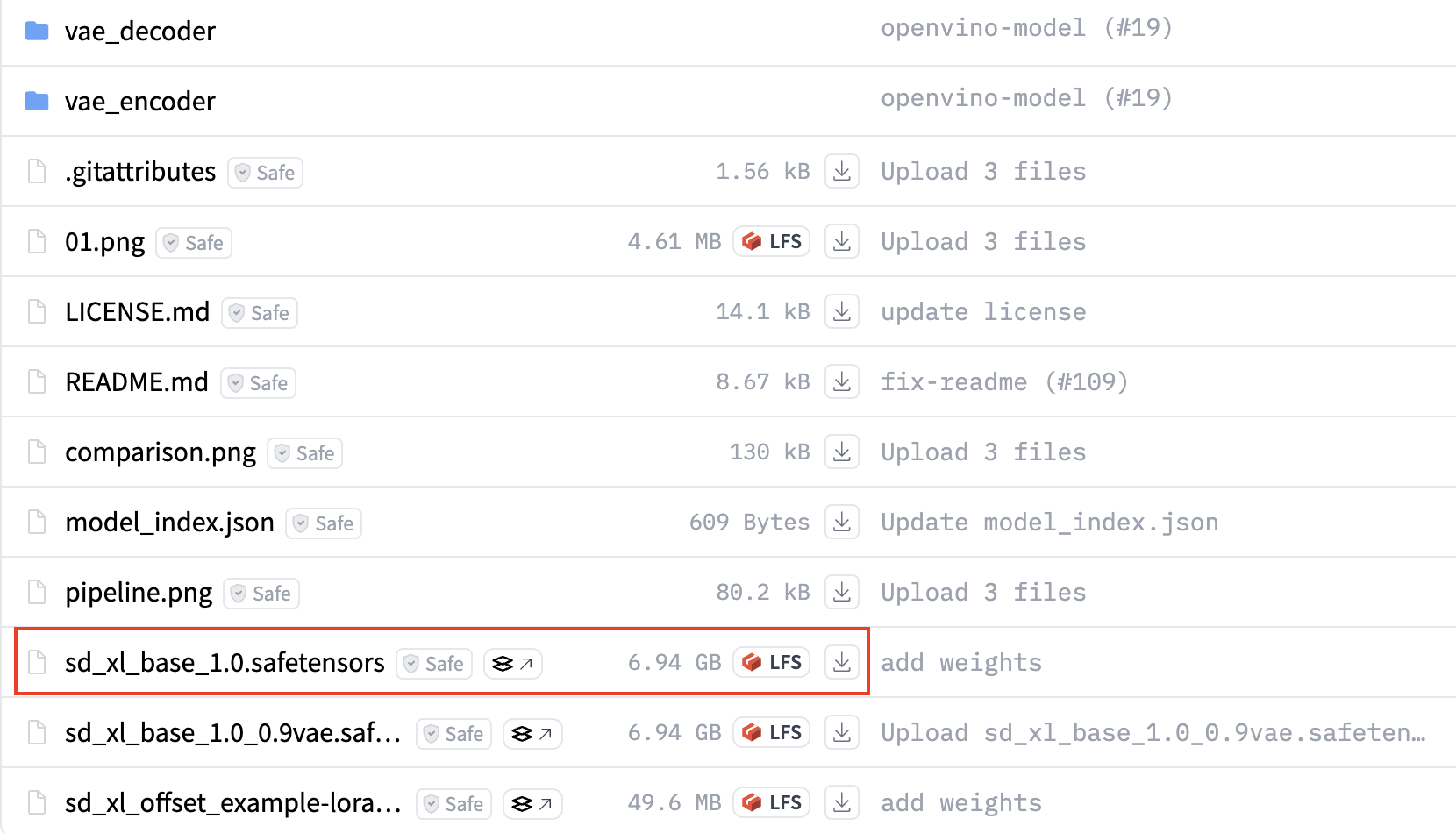 stable-diffusion-xl-base-1.0 페이지에서 Base 모델, Refiner 모델 및 VAE의 세 파일 을 다운로드합니다.