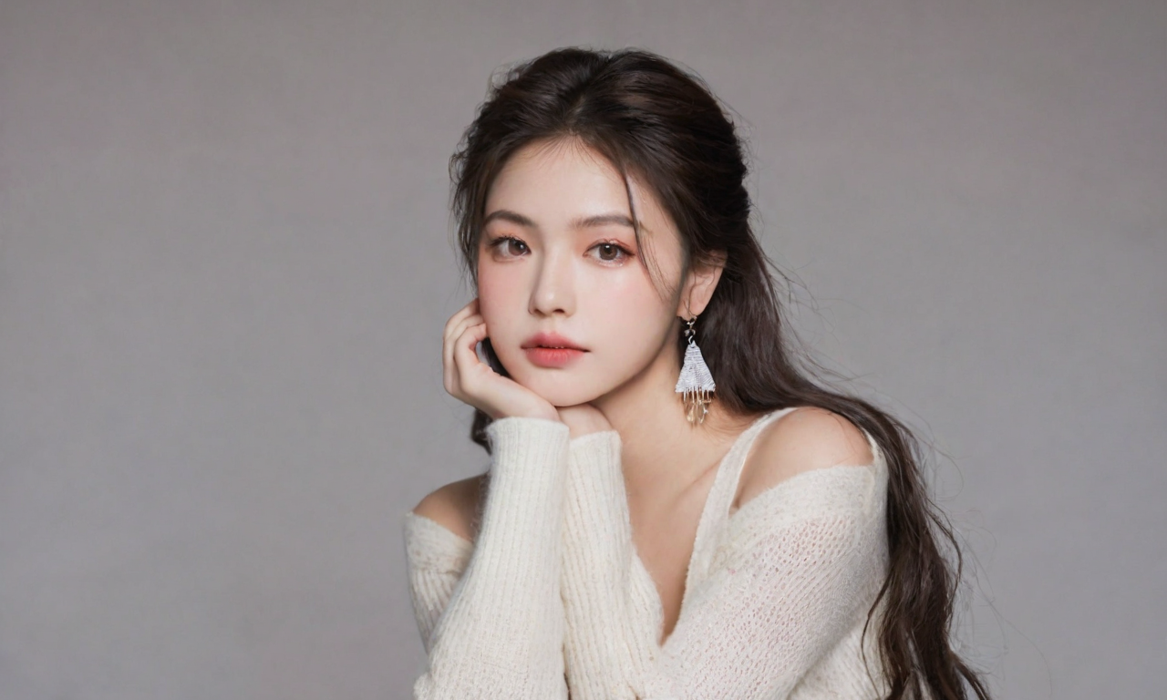 The image portrays a young woman with a delicate and ethereal appearance. She dons a white knitted sweater that gives off a warm and cozy vibe. Her complexion is impeccably fair, complemented by striking makeup featuring rosy blush on her cheeks and glossy lips. A pair of captivating earrings adorns one ear, adding an element of sophistication. With long, dark hair cascading down her shoulders, she gently holds strands with both hands, giving a sense of contemplation or introspection. Overall, the image exudes a serene and enchanting ambiance.