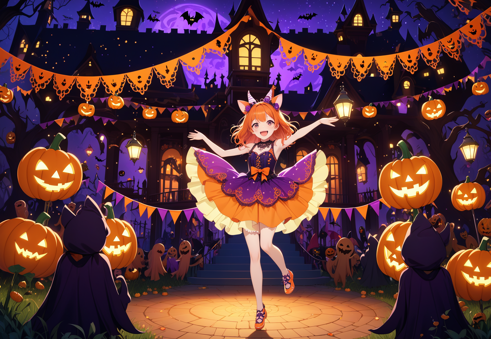 masterpiece, best quality, intricate detail, halloween party, many cute monsters around,1girl dancing at park, girly, (outdoor, haunted house, night), spotlights, light particles, glow,looking at viewer, purple dress, delicate patterns, aura,orange hair, animal ears, bangs, full body,happy, smile, enjoy, blush, shame, open mouth, turn up eyes,(masterpiece, best quality, intricate detail, beautiful artwork),