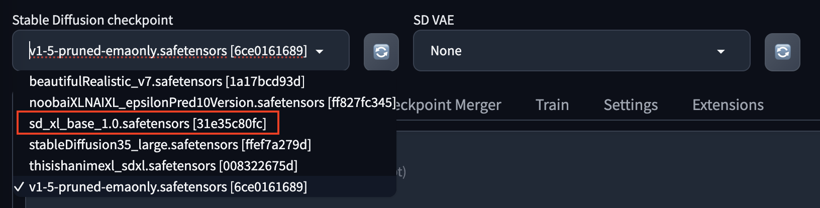 모델을 적용하려면 Stable Diffusion Web UI 왼쪽 상단의 탭에서 전환합니다.