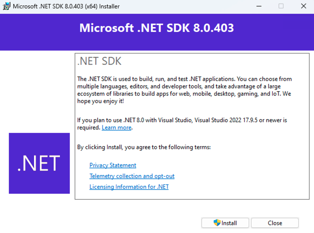Download .NET 8.0 SDK (v8.0.403) - Windows x64 Installer