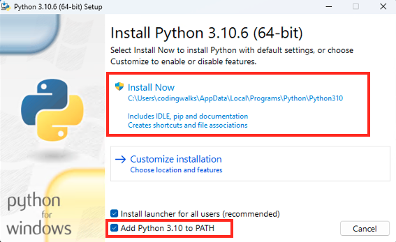 다운로드한 설치 프로그램 python-3.10.6-amd64.exe을 실행합니다. 저자는 이미 설치가 되어 있어서 "Upgrade Now"라고 뜨지만 처음 실행하게되면 "Install Now"가 보입니다. 아래쪽 체크박스 중에서 "Add Python 3.10 to Path"를 체크하고, "Install Now" 버튼을 누르면 설치가 시작됩니다. 그리고 "Setup was successful"이 표시되면 Python 설치가 정상적으로 완료되었습니다.