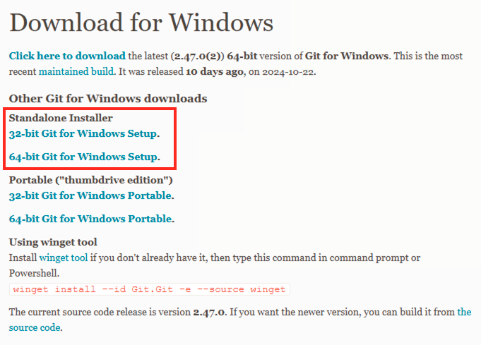 Download for Windows Click here to download the latest (2.47.0(2)) 64-bit version of Git for Windows. This is the most recent maintained build. It was released on 2024-10-22. Other Git for Windows downloads Standalone Installer 32-bit Git for Windows Setup
