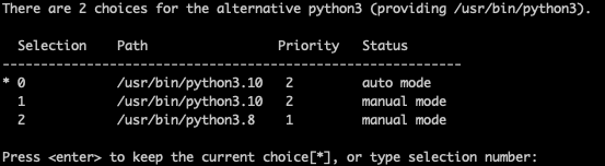 - 기존 버전인 3.8과 신규 버전인 3.10을 update-alternatives에 등록하고 인덱스를 지정해줍니다.